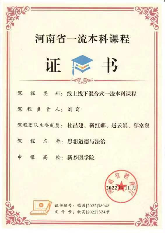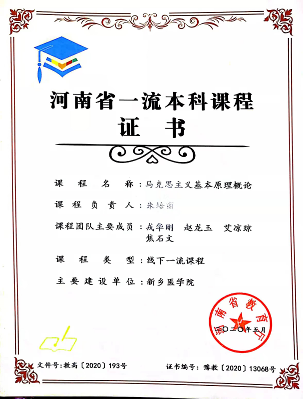 学院加强课程教学全过程管理和监督,创设“网络导学+专题教学+小班研讨+实践拓展”四位一体的教学模式。近年来,《纲要》课程入选国家级一流课程、河南省精品在线开放课程。《原理》、《纲要》、《德法》等课程获批省级一流本科课程。《原理》、《纲要》、《概论》等课程先后获批省高校优秀课程。