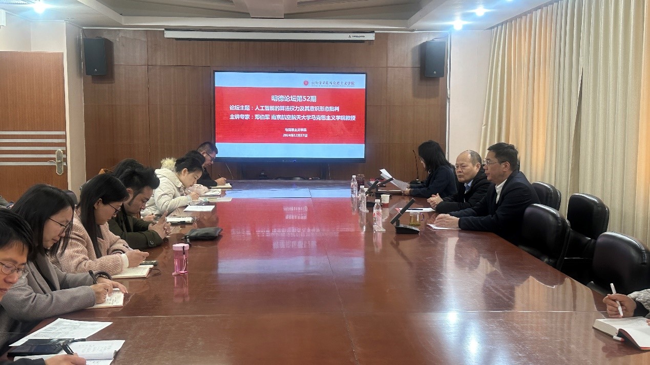 12月17日上午,马克思主义学院、河南省高校思政课名师刘红工作室在北校区勤政楼308会议室联合举办第52期明德论坛。院长靳书君、教师代表及全体研究生参加,论坛由副院长朱培丽主持。
