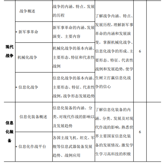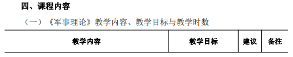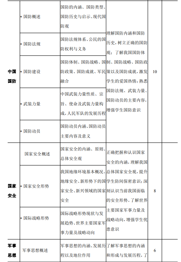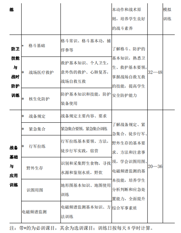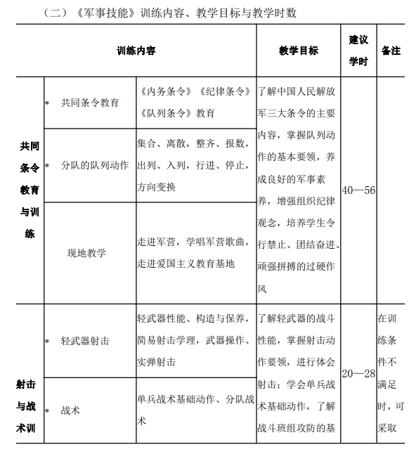 军事课纳入普通高等学校人才培养体系,列入学校人才培养方案和教学计划,实行学分制管理,课程考核成绩记入学籍档案。军事课由《军事理论》《军事技能》两部分组成。《军事理论》教学时36 学时,记 2 学分;《军事技能》训练时间 2—3 周,实际训练时间不得少于 14天 112 学时,记 2 学分。课程内容含“必讲(必训)”内容(以“*”标识)和“选讲(选训)”内容(其他未标识者),各学校可根据本校实际情况在确保完成“必讲(必训)”内容的基础上,灵活选择“选讲(选训)”内容,但必须完成总学时。普通高等学校要严格按纲施教、施训和考核,严禁以任何理由和方式调减、占用教学、训练内容和时数。