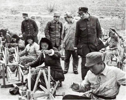 (萧劲光(站立者右一)等参观延安机关干部纺线)