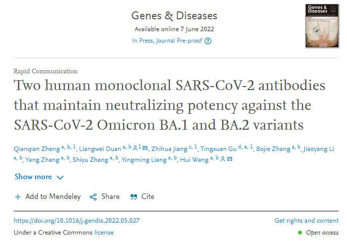 近日,国际著名期刊Gene & Diseases在线发表了题为“Two human monoclonal SARS-CoV-2 antibodies that maintain neutralizing potency against the SARS-CoV-2 Omicron BA.1 and BA.2 variants”的研究成果。我校河南省免疫与靶向药物重点实验室、医学检验学院郑前前博士等为第一作者,王辉教授和段良伟博士为共同通讯作者,我校为第一作者单位和通讯作者单位。该研究成果得到了国家111计划、国家自然科学基金项目、省科技攻关项目等资助。
