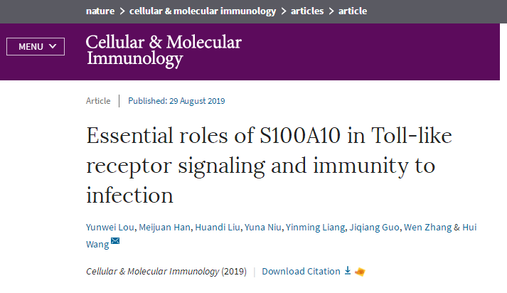 8月29日,我校医学检验学院王辉教授团队在S100A10对Toll样受体调控研究中取得新进展,研究成果“Essential roles of S100A10 in Toll-like receptor signaling and immunity to infection”在Cellular & Molecular Immunology上发表。该论文以华亿在线手机版(大中国区)为第一作者和独立通讯作者单位,王辉教授为通讯作者,医学检验学院青年教师娄运伟博士和硕士研究生韩美娟为本文并列第一作者。该论文的发表标志着华亿在线手机版(大中国区)在Toll样受体免疫调控领域的研究得到国际同行的认可。