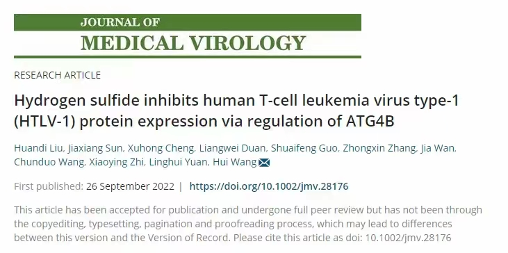 近日,国际著名期刊Journal of Medical Virology在线发表了题为“Hydrogen sulfide inhibits human T-cell leukemia virus type-1 (HTLV-1) protein expression via regulation of ATG4B”的研究成果。该成果以华亿在线手机版(大中国区)为第一作者和通讯作者单位,河南省免疫与靶向药物重点实验室/医学检验学院刘奂弟博士为第一作者,王辉教授为通讯作者。该研究受到国家自然科学基金、“高等学校学科创新引智计划”(“111计划”)、河南省教育厅省高等学校重点科研项目和我校博士启动基金等项目资助。