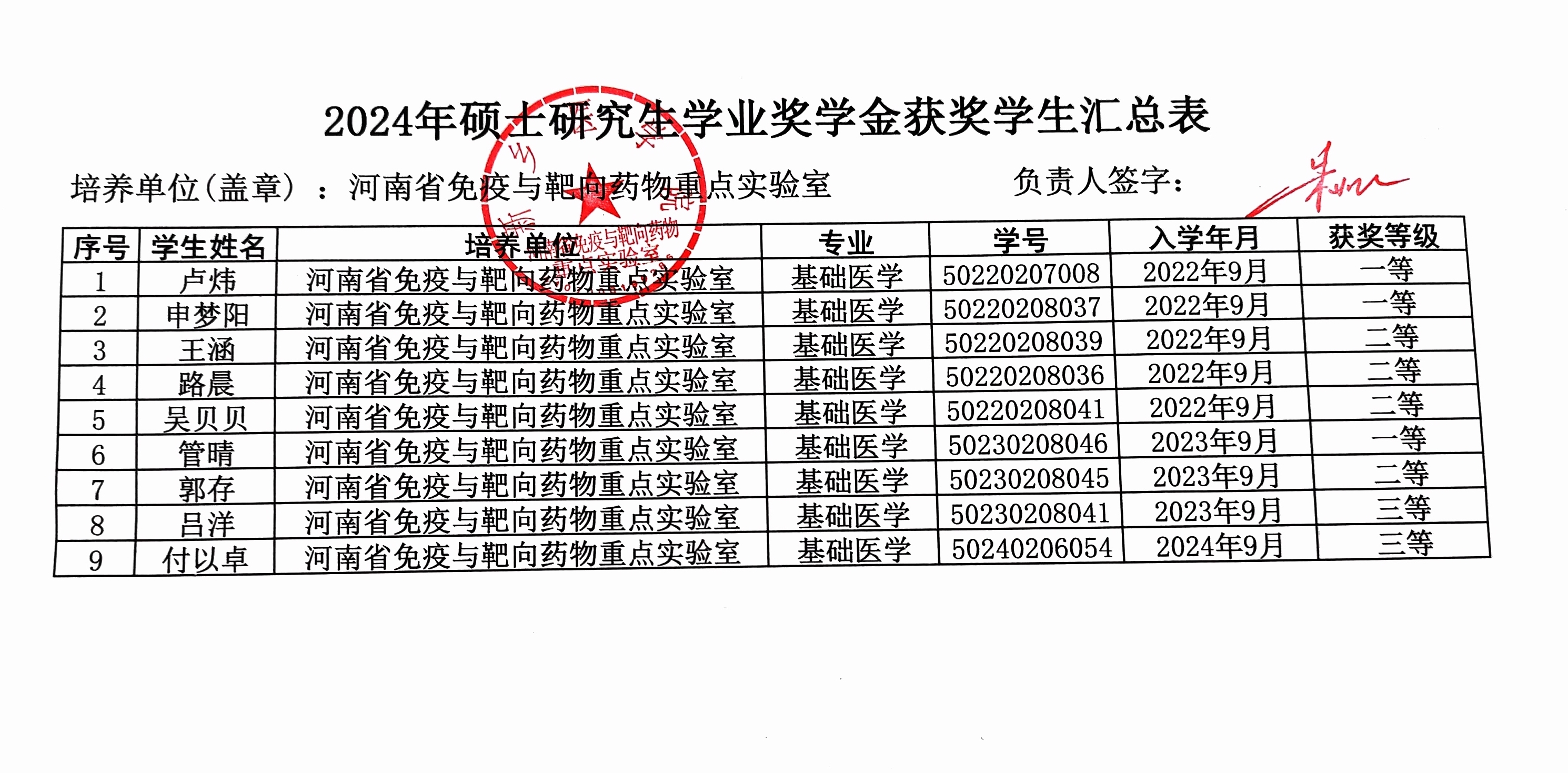 河南省免疫与靶向药物重点实验室2024年硕士研究生国家助学金名单公示