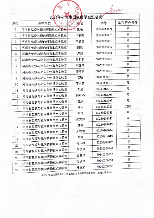 上一条:河南省免疫与靶向药物重点实验室2024年硕士研究生学业奖学金拟获奖学生名单公示 下一条:2024年河南省免疫与靶向药物重点实验室研究生奖学金评审排序