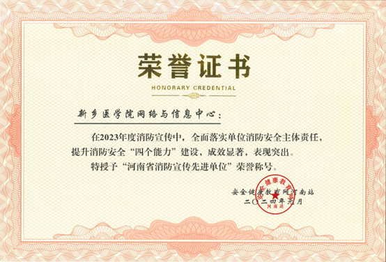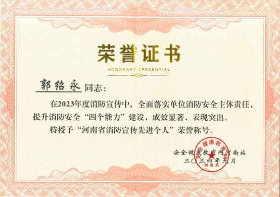 在2023年消防宣传中,中心全面落实单位消防宣传安全主体责任,提升消防安全“四个能力”建设,成效显著,表现突出,被河南省安全健康教育网授予“河南省”消防宣传先进单位”荣誉称号,郭绍永同志因个人在消防安全工作中表现优异,被授予“河南省消防宣传先进个人”。