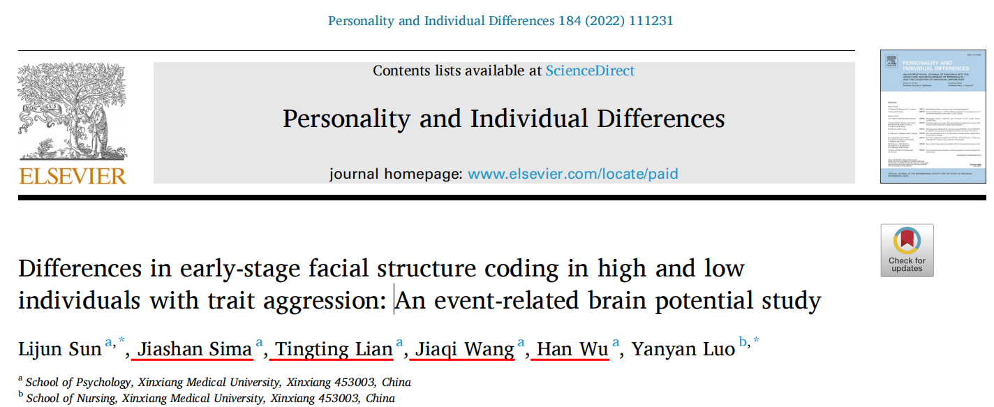 近日,我院本科生司马嘉珊、连婷婷,王佳琪,武涵的研究成果《Differences in early-stage facial structure coding in high and low individuals with trait aggression: An event-related brain potential study》在线发表在学术期刊《Personality and Individual Differences》。