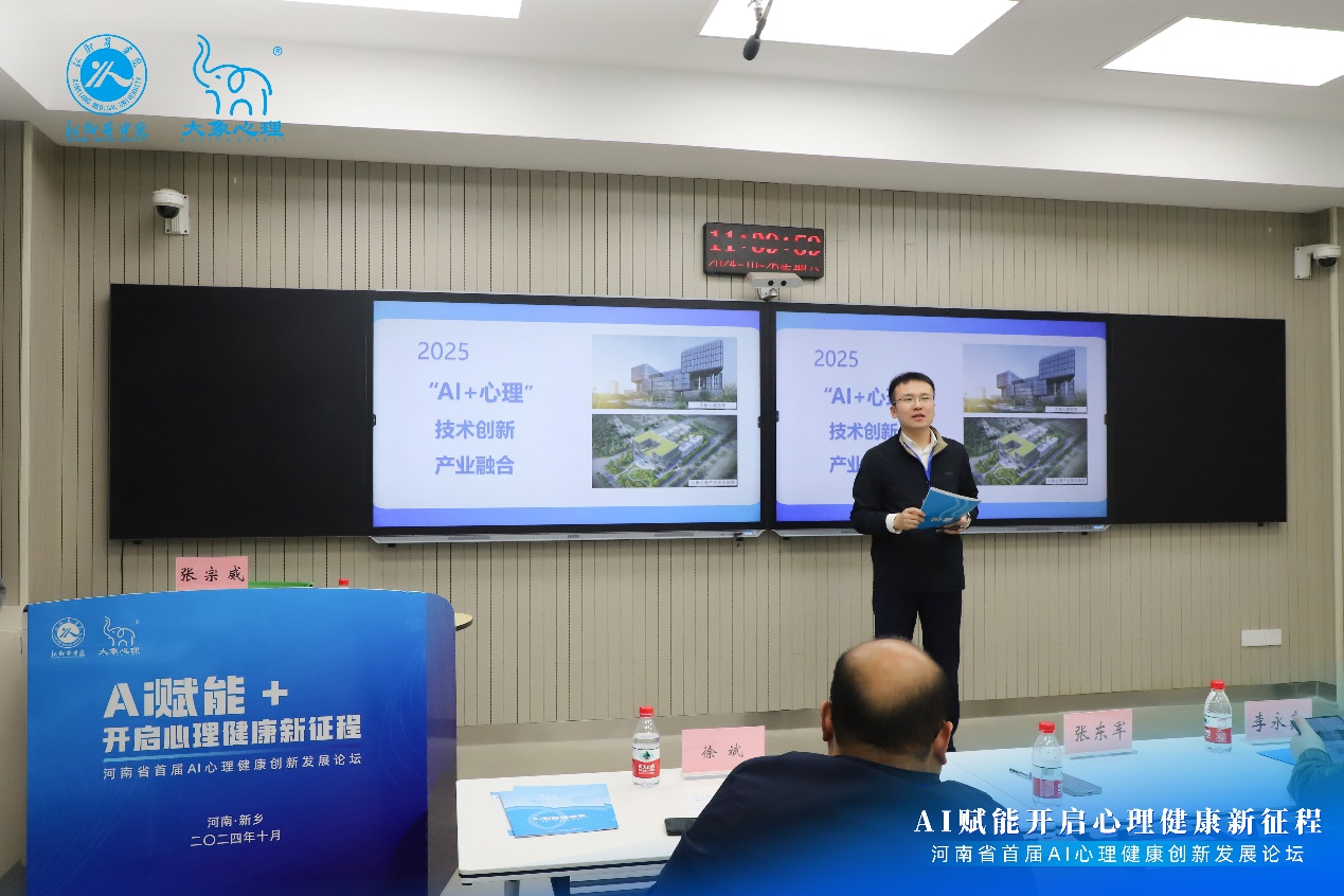 汤开智博士以《生成式人工智能在心理行业的研究和应用》为题,分享了AI在心理健康领域的广泛应用潜力,对AI推动心理服务创新发展提出独到见解。大象心理CEO张宗威在主旨演讲《AI+心理技术创新与产业融合》中展示了AI心理健康筛查系统的应用成效,并强调未来将继续整合AI、大数据等前沿科技,推动心理健康教育的智能化转型。