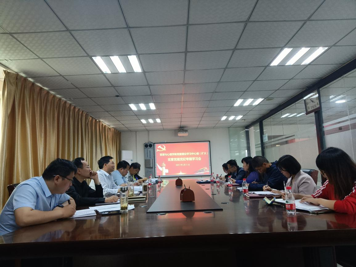 5月11日下午,管理与心理学院党委在西校区综合楼7楼会议室召开理论学习中心组(扩大)党章党规党纪专题学习会。学院党委理论学习中心组全体全体成员、非党员处级干部、党政办主任、学工办主任和党支部书记等参加了会议。会议由党委书记张献领主持。