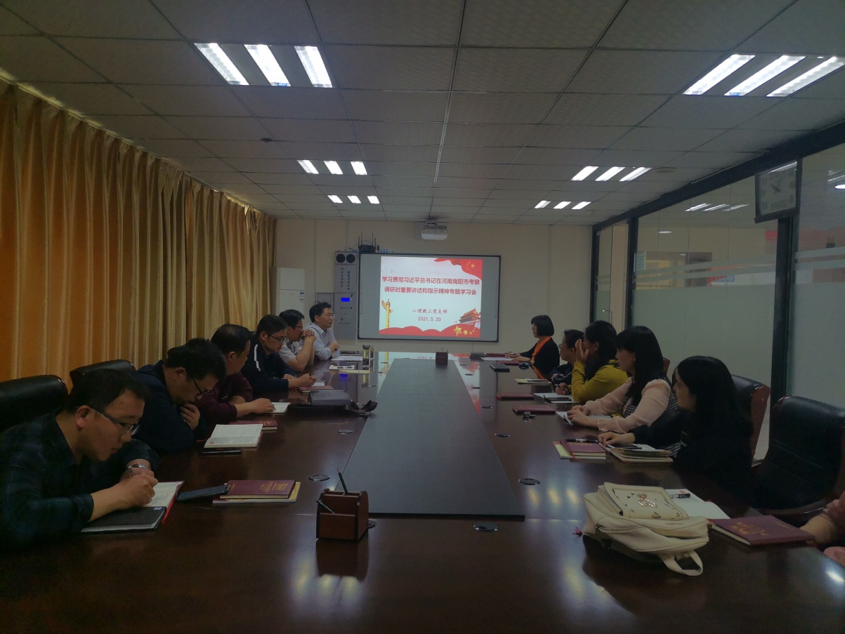 全体与会人员集中学习了习近平主持召开推进南水北调后续工程高质量发展座谈会及重要讲话精神。学习后,大家进行了发言讨论。之后,党委书记张献领对习近平总书记在河南南阳市考察调研时重要讲话和指示精神进行了深刻解读,他指出,习近平总书记的重要讲话,高屋建瓴、统揽全局、思想深邃、内涵丰富,具有重大指导意义。随后,张献领提出三点要求:一、要把学通弄懂做实总书记重要讲话和指示精神作为首要政治任务,认真学习,从中真切感受到总书记对人民群众的深情牵挂、对生态建设的念兹在兹。二、要深刻学习领会、吃透精神实质、把准核心要义,全面对标践行,将其转化为推动工作、造福师生的务实举措。 三、要结合党史学习教育,主动担当,积极作为,扎实开展“我为师生办实事”实践活动。