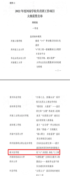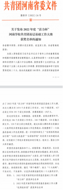 近日,共青团河南省委印发《关于发布2022年度“活力杯”河南学校共青团基层基础工作大赛获奖名单的通知》,(以下简称《通知》)。《通知》对在2022年度河南高校共青团项目大赛中获奖的共青团工作项目、微团课、团支书和团支部进行表彰。我院团委申报的《创“心”共青团,特色“三三制”》在基层组织建设类项目中荣获2022年度河南高校共青团项目大赛(高校组)一等奖;《“疫”心以“医”》在校园文化类项目中荣获2022年度河南高校共青团项目大赛(高校组)三等奖。