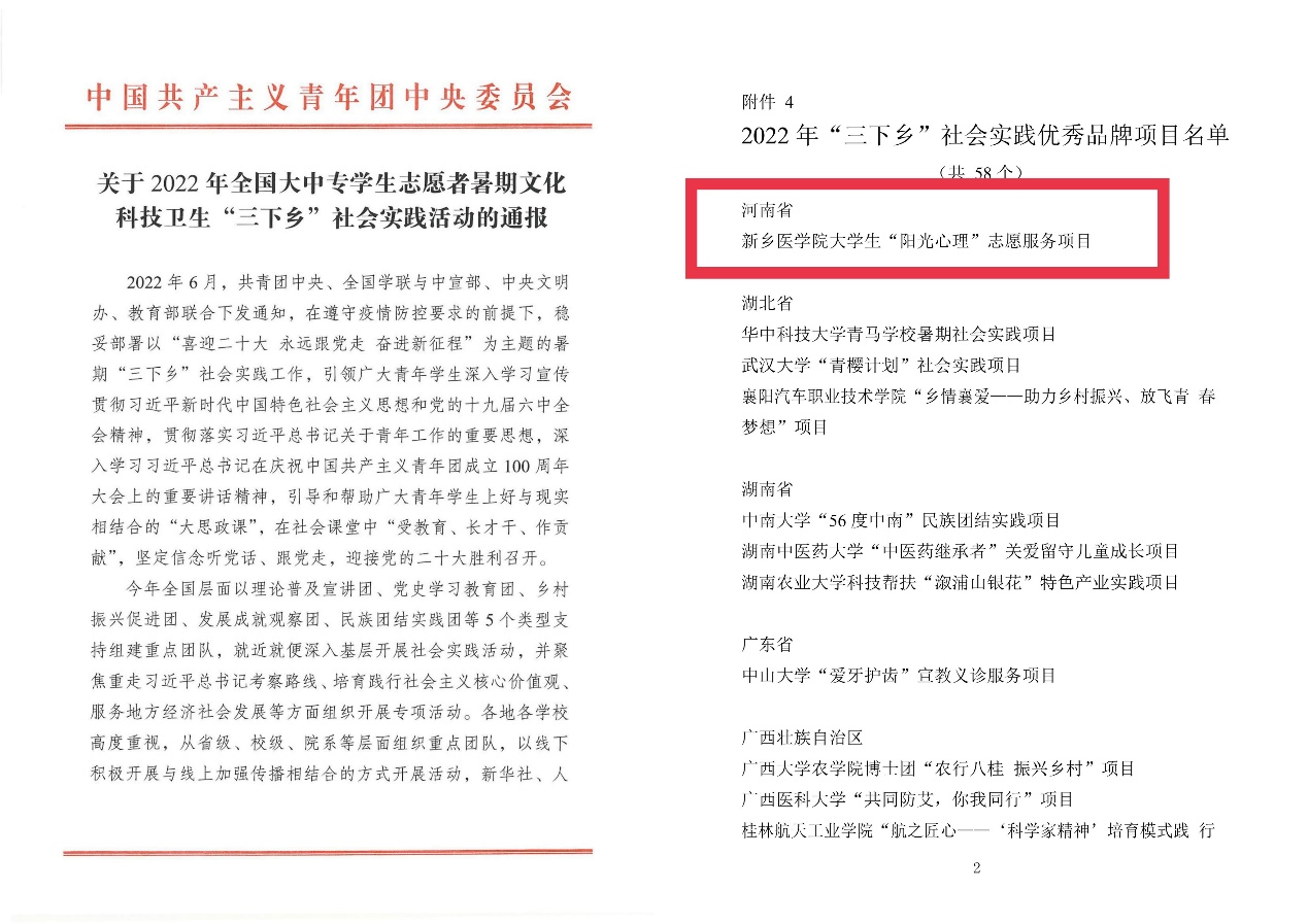 我院大学生“阳光心理”志愿服务项目获2022年全国 “三下乡”社会实践活动优秀品牌项目。全国共58项,我校为全省唯一获此荣誉的高校。同时,该项目获2022 年全省暑期“三下乡”社会实践活动优秀品牌项目。