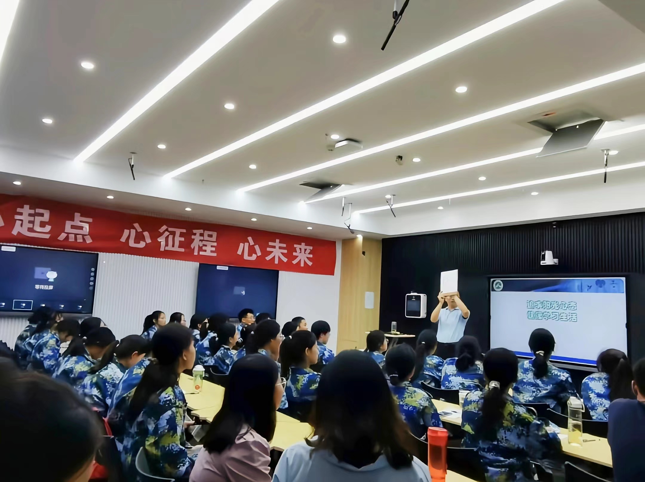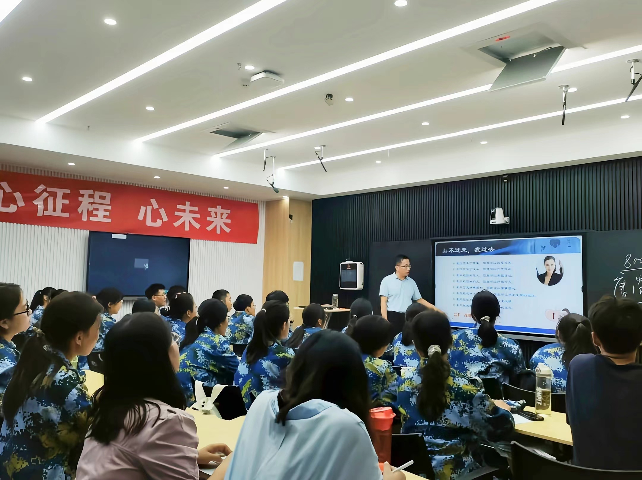 课间,张东军和同学们亲切互动,共同谈讨每人心中的心理健康,告诉大家积极向上、有目标、身体和心灵的双重健康才是真正的心理健康。同学们都积极踊跃地发表自己的看法。阵阵欢笑充满课堂。