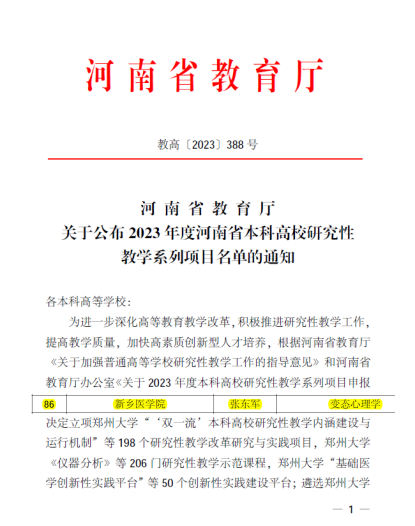 河南省教育厅近年来组织开展本科高校研究性教学系列项目申报工作,包括研究性教学改革研究与实践项目、研究性教学示范课程、创新型人才培养典型案例、研发性实践教学优秀成果、创新性实践建设平台项目等。我院积极参与了研究性教学改革研究与实践项目和研究性教学示范课程申报。此次《变态心理学》获批为研究性教学示范课程,既是对过去努力的肯定,也是对未来发展的鼓励。下一步我院将以此为契机,进一步深化高等教育教学改革,积极推进研究性教学工作,提高教学质量,加快高素质创新型人才培养。