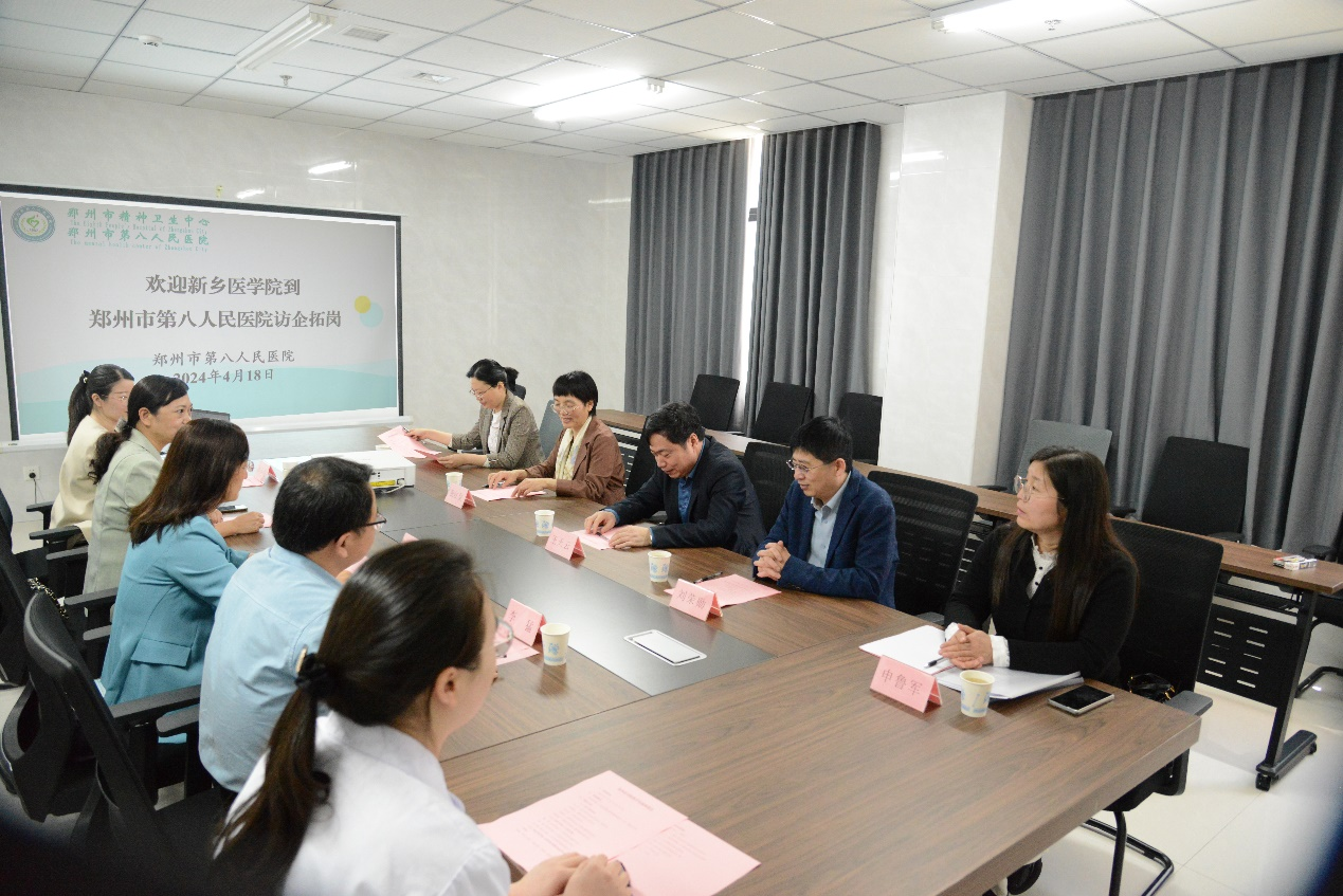 随后赴郑州市第八人民医院宜居健康城院区看望实习学生以及已于八院就业的我院毕业生,并进行座谈,八院党委委员、副院长孔德荣对王天云校长一行表示热烈欢迎,介绍了医院的发展现状和学生的带教培养情况等,鉴于校院双方前期良好的合作基础,期望双方加大人才培养和科研合作力度,推进深化合作,为精神卫生和心理卫生事业培养更多高质量应用型人才。王天云校长对八院工作给予了充分肯定和衷心感谢,并探讨了双方在人才培养、科研合作、毕业生就业等方面的合作事宜。