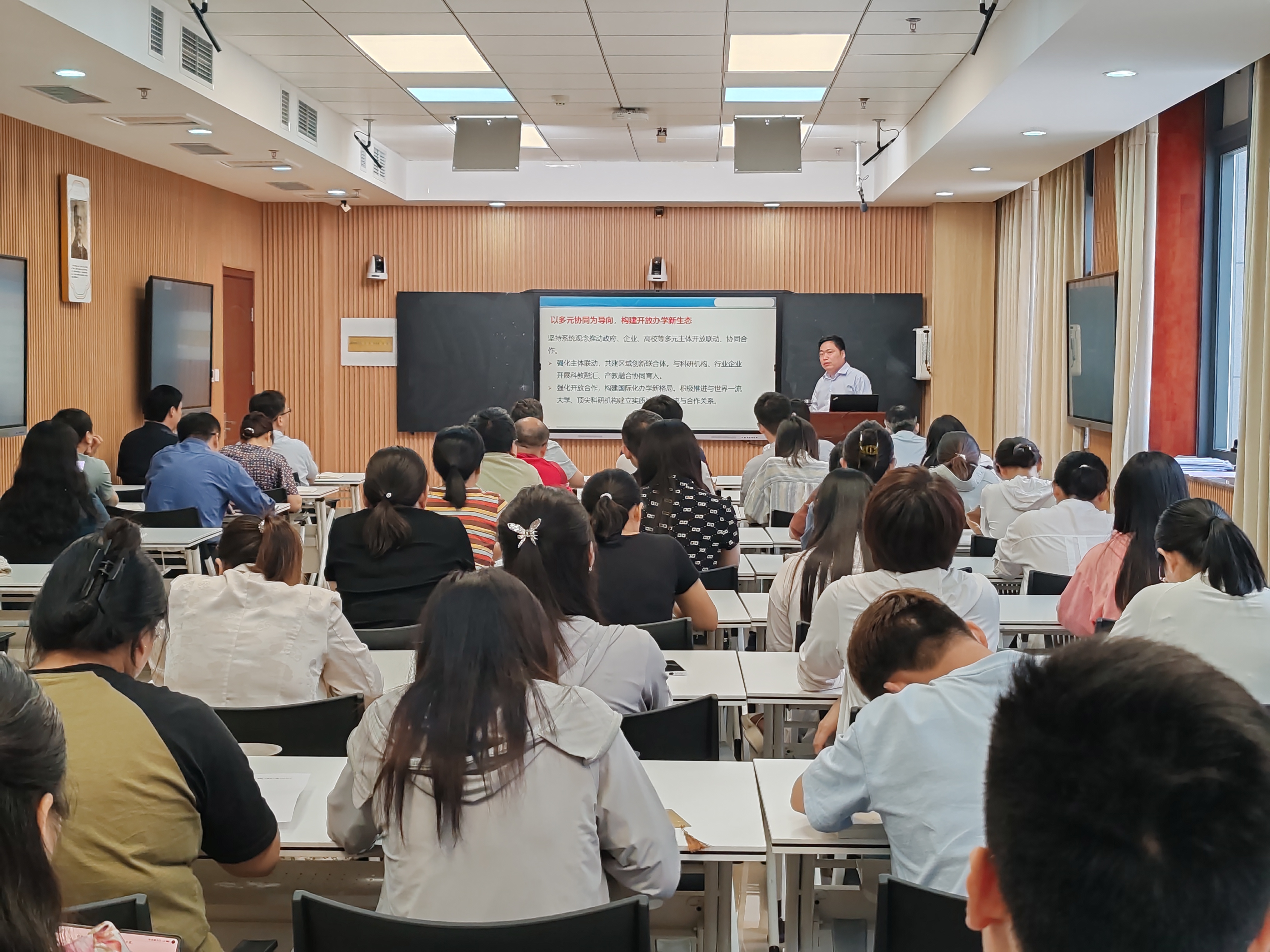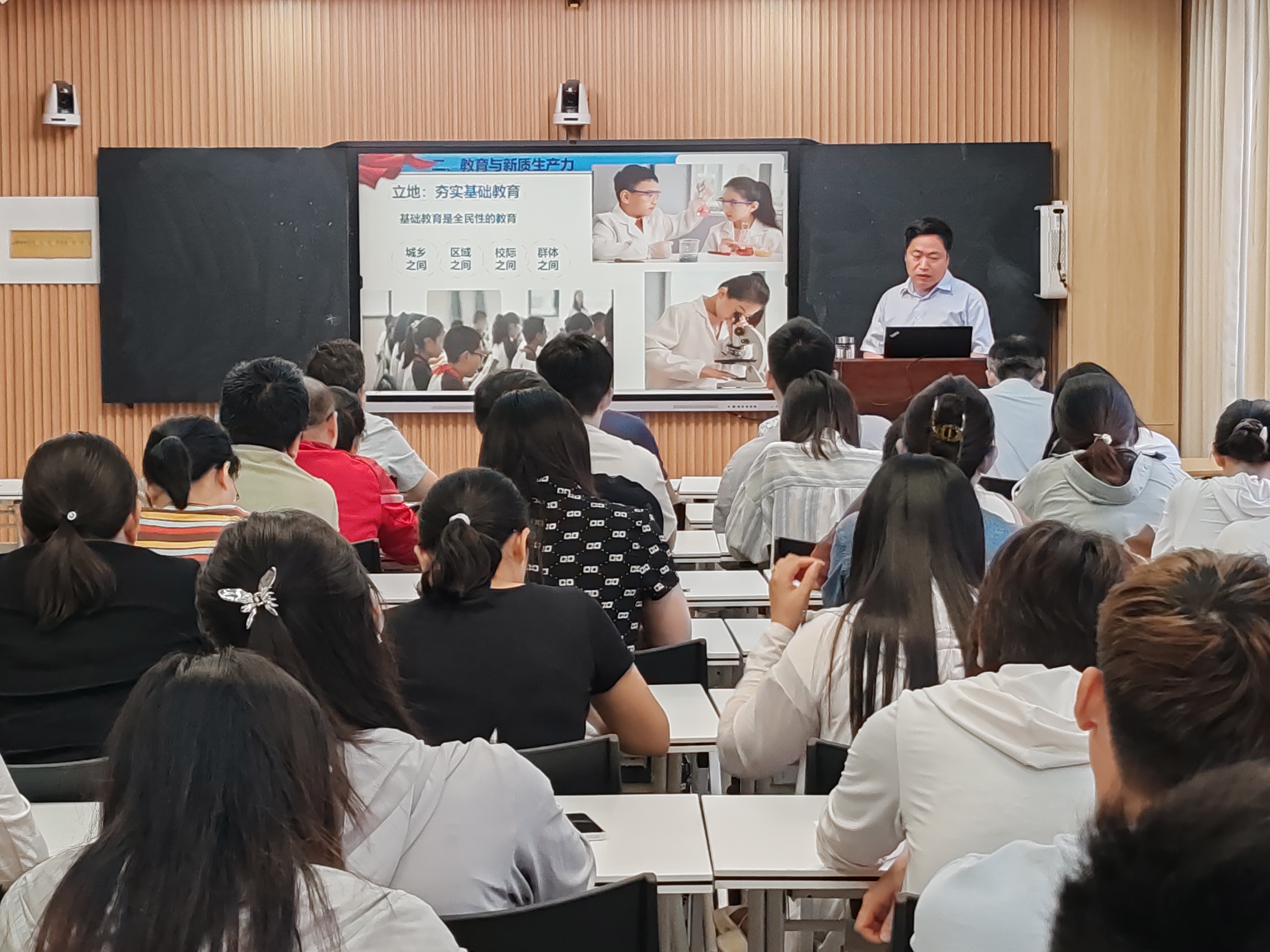 为深入学习贯彻习近平新时代中国特色社会主义思想和党的二十大精神,坚定理想信念,2024年6月3日下午,校党委委员、副校长王天云以“培育新质生产力 促进学校高质量发展”为主题,为心理学院、卫生健康管理学院师生讲授思政课。两个学院全体教师党员、中层干部、学生党员代表等参加学习。