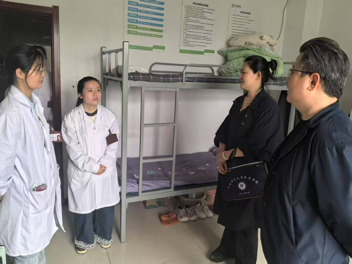 随后,陈宏一行赴郑州市第九人民医院看望实习生并举行座谈,郑州市第九人民医院心理医院院长常国胜、副院长李丽等出席座谈会。座谈会上,心理医院院长常国胜对陈宏一行表示热烈欢迎;接着,卜杨介绍了实习生的实习情况,对我校实习生综合表现给予了充分肯定;陈宏衷心感谢九院对实习生的悉心指导和关怀,强调加强校院合作、协同育人对于培养高素质心理人才具有重要意义,并就教育教学、实习就业一体化基地建设、人才培养等方面进行了深入交流。会后,陈宏一行对实习学生的宿舍进行了实地参观和考察。