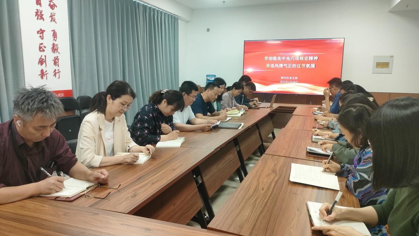 会上,支部书记徐自超领学并深入解读了中央八项规定相关文件精神,传达了《关于2025年“五一”、端午期间严明纪律的通知》、中央纪委监委公开通报十起违反中央八项规定精神典型问题和省纪委监委公开通报六起违反中央八项规定精神典型问题。并强调,一要做好中央八项规定精神的贯彻落实。以高度的政治自觉抓好学习教育,深刻领会中央八项规定精神实质,充分利用各类学习平台持续学习,为推动支部发展提供坚强纪律保障。二要着力涵养清廉文明的节日风气。党员干部要以身作则,念好廉政“紧箍咒”,严防节日期间“四风”问题反弹,积极营造风清气正、崇廉尚俭的节日氛围。三要加强节日期间安全管理。下班离岗时要关闭电源和门窗,进行办公区域防火检查,节日出行要注意行车安全,切实做好节假日期间安全工作。