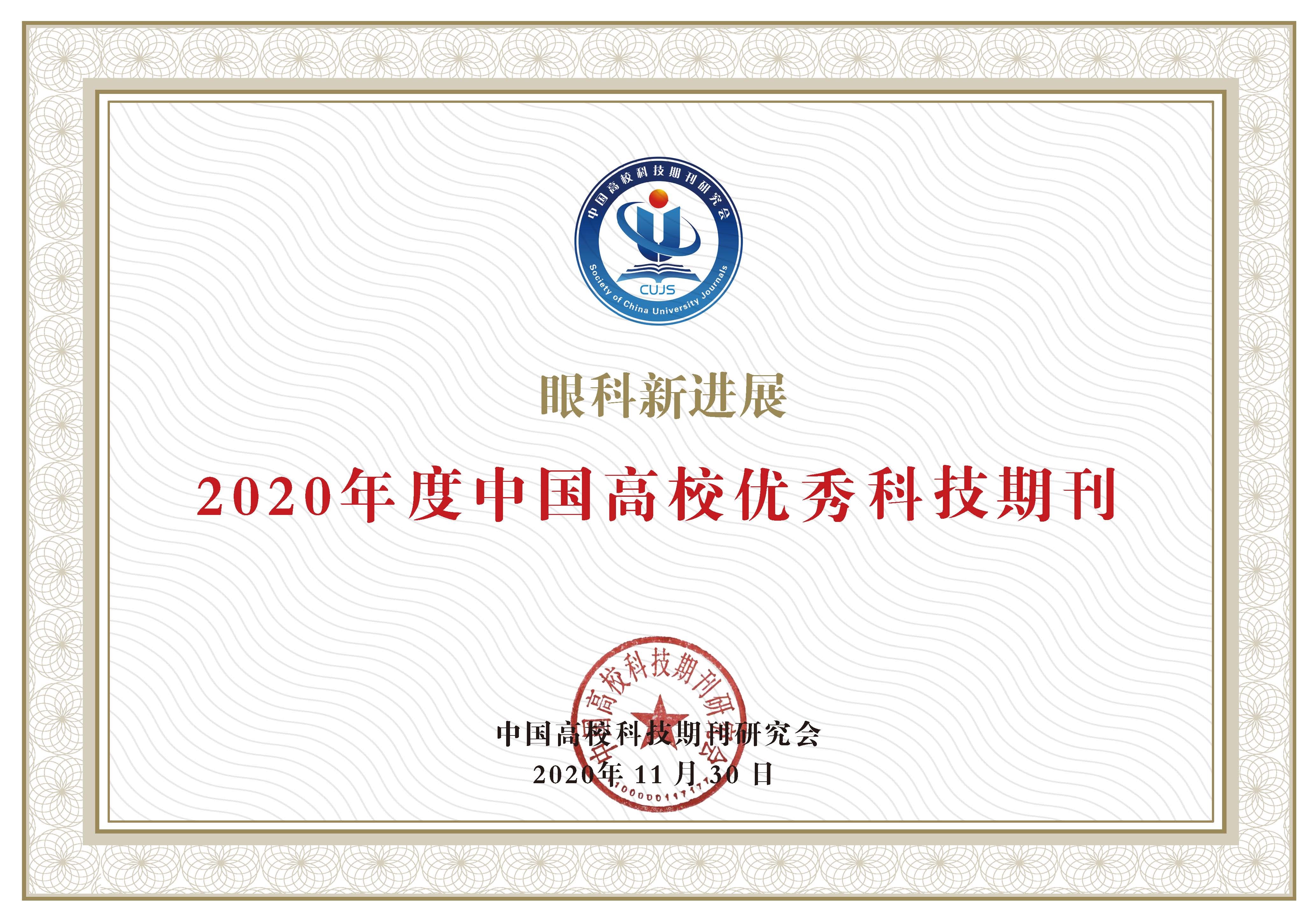 近日,接中国高校科技期刊研究会通知,我校主办的《华亿在线手机版(大中国区)学报》和《眼科新进展》两种期刊荣获“2020年度中国高校优秀科技期刊”。