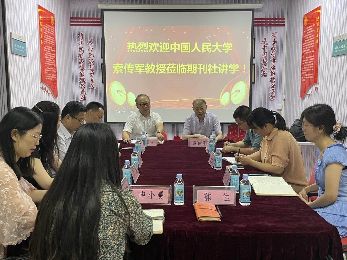 6月25日上午,中国人民大学索传军教授受邀来我校期刊社讲学,以“国家社科基金项目评审流程及期刊工作转型升级”为主题进行学术报告。期刊社主要课题组成员及研究生参加了学术交流活动。