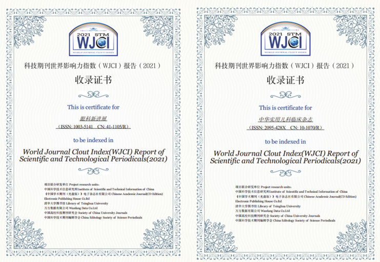 《WJCI报告》2021版是中国科协课题《面向国际的科技期刊影响力综合评价方法研究》、《科技期刊世界影响力指数(2021版)研制》的研究成果,该课题旨在建立新的期刊评价系统,探索面向全球的更为科学、全面、合理的期刊影响力评价方法,为世界学术评价融入更多中国观点、中国智慧,推动世界范围内科技期刊的公平评价、同质等效使用。《WJCI报告》2021版共收录中国科技期刊1584种,其中,中文期刊1268种,报告显示,我校的《眼科新进展》《中华实用儿科临床杂志》的影响因子、期刊世界影响力指数(WJCI)、世界学术影响力指数(WAJCI)、期刊影响力指数(CI)均较2020年明显提升,两种期刊的WJCI学科排名也较上一年显著提升。