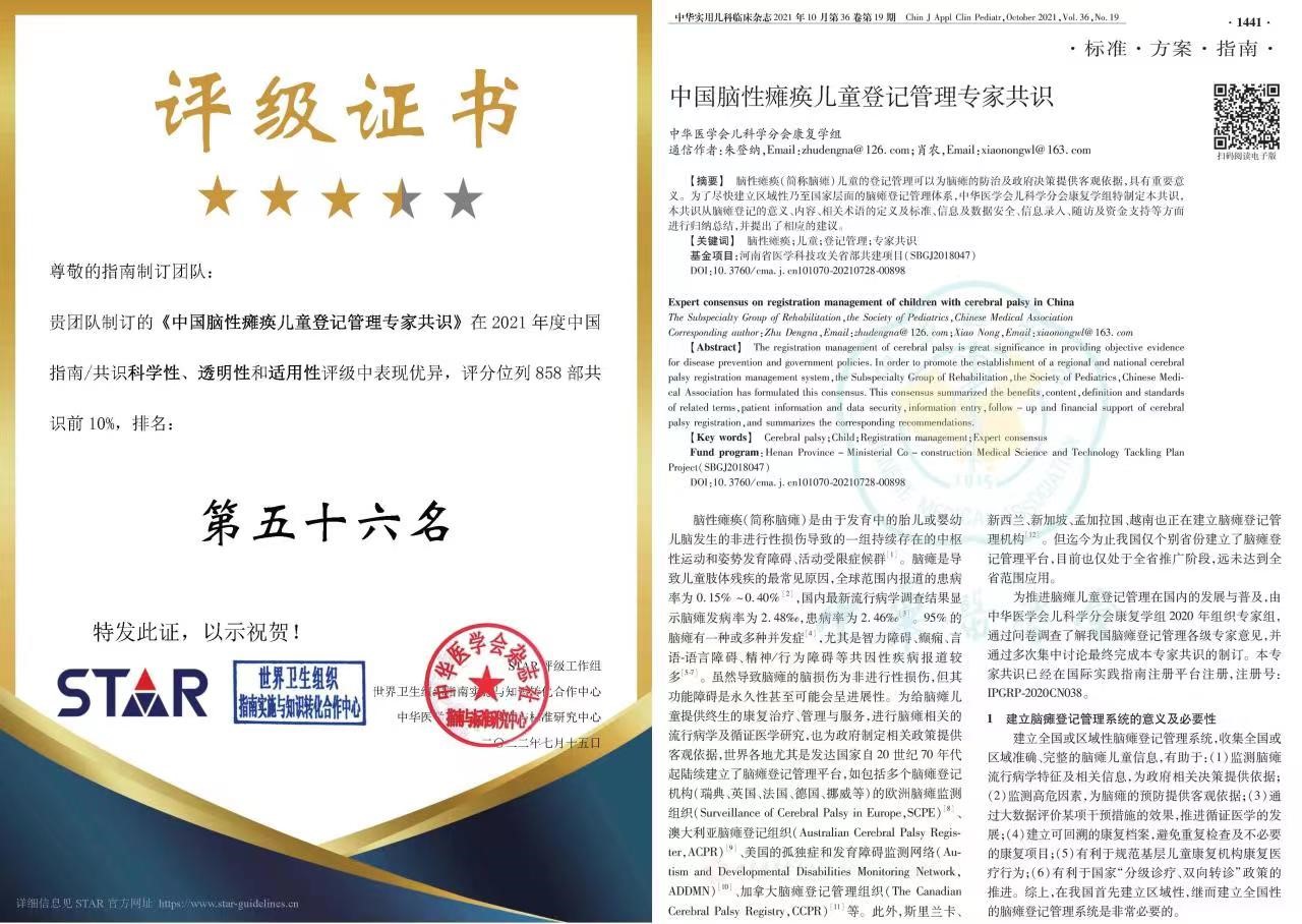 2022年7月15日,第二届临床实践指南科学性、透明性和适用性评级工具STAR学术年会召开,会上发布了年度评价报告,并公布了优秀指南/共识名单,我校《中华实用儿科临床杂志》2021年刊登的《中国儿童过敏原检测临床应用专家共识(2021版)》《中国脑性瘫痪儿童登记管理专家共识》在收录的858篇中国共识中分别排在第5位和第56位,在52篇儿科学共识中分别排在第2位和第8位。