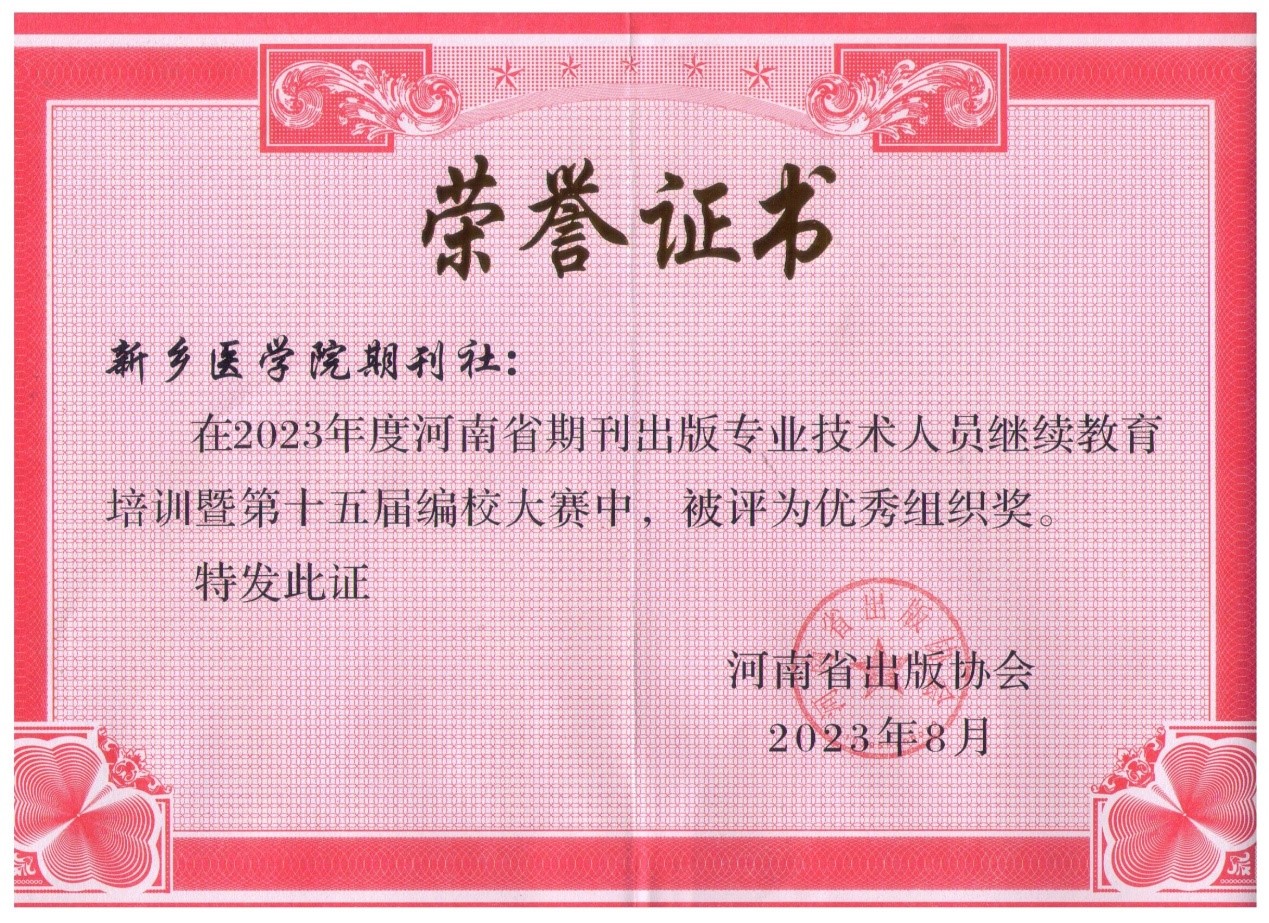 近日,接河南省出版协会《关于表彰2023年度河南省期刊出版专业技术人员继续教育培训暨第十五届编校大赛获奖单位和人员的决定》文件通知,在河南省第十五届编校大赛中,期刊社被评为优秀组织奖,张艳丽、廉珍珍、郭潇、臧赫4位编辑荣获编校大赛二等奖。