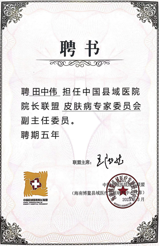 会上,田中伟教授受聘为中国县域院长联盟皮肤病专家委员会副主任委员。