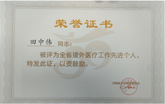 本网讯(沈承亮/文 杨来福/图)4月25日,河南省承派援外医疗队50周年纪念会议暨援外医疗队出征仪式在郑州举行。会议宣读了《河南省卫生健康委员会关于表扬全省援外医疗工作先进集体和先进个人的通报》,我院田中伟教授荣获“河南省援外医疗先进个人”称号。