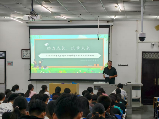 本网讯(杨子轩/文 石沛鑫/图)9月3日,我院召开家庭经济困难学生认定工作政策宣讲会议,2023级、2024级全体同学参会。会议以“助力成长,筑梦未来”为核心,旨在全面解读资助政策,确保家庭经济困难学生清晰了解认定流程与相关保障,切实解决求学后顾之忧,安心投入医学专业学习。