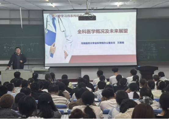 随后,学院综合办公室主任万勇敢为新生带来了详细的专业介绍。万勇敢表示,全科医学是整合临床医学、预防医学、康复医学及人文社会学科于一体的综合性临床二级学科,他详细阐述了我院全科医学人才的培养目标,即面向基层的高素质应用型人才。他指出,当前医学教育正迈向以“系统为基础、胜任力为导向”的第三代改革,希望同学们能主动适应,尽早树立职业理想,成长为居民健康的“守门人”。