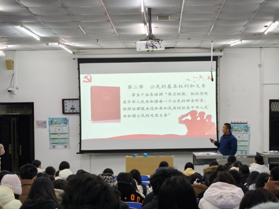 宣讲会上,李磊以《中华人民共和国宪法》相关规定为切入点,系统讲解政策支持、招收条件及征兵流程三大核心内容。在政策支持方面,详细介绍了退役复学转专业、免修相关课程、考研加分、专项招生计划等学业保障,列明义务兵津贴、学费补偿代偿等多项经济补贴标准,以及退役军人在出行、医疗、法律援助等方面的专属优待。在招收条件上,明确了男女兵的年龄、身高、体重、视力等具体要求。在征兵流程上,解读了“一年两征” 政策调整,按网上报名、初审初检、体检考评、政治考核等环节逐一说明,让学生全面掌握征兵关键信息。