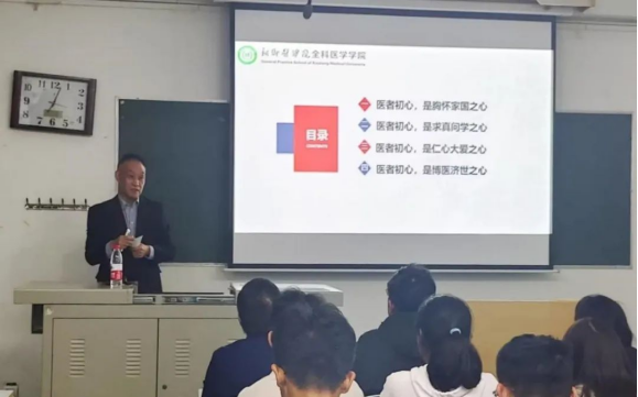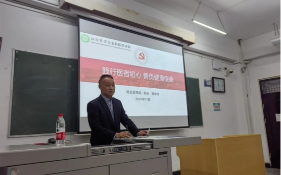 本网讯(晋梦雪/文 常远昊/图)医学殿堂之内,仁心与德行,乃两把不可或缺之钥匙。医者仁心,医者德行,皆为医之内涵与要求。为进一步增强大学生的家国情怀及使命感,激发他们对医疗行业的热爱和责任感,培养学生医者仁心的品质,2023年11月3日,我院党总支书记、院长田中伟受邀在博济楼2210教室为2023级临床医学专业学生干部开展《践行医者仁心 勇负健康使命》思政教育讲座。