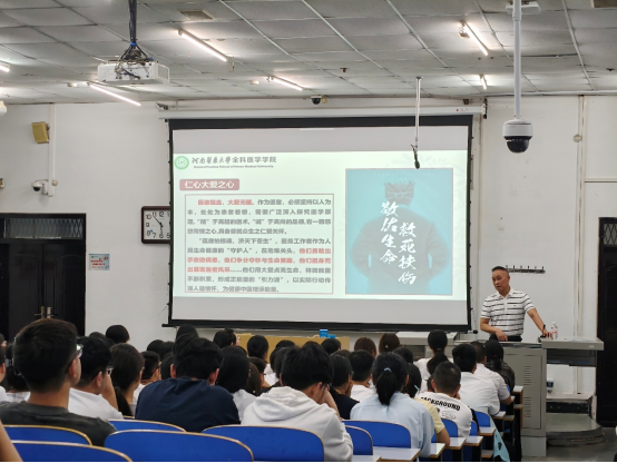 大会伊始,学生辅导员包巍进行自我介绍,以亲切的话语欢迎全体新生的到来,为新生们消除初入校园的陌生感。随后,田中伟以“恪守医者初心,担当健康使命”为主题开展“开学第一课”。他从学院发展历程与学校办学历史切入,深入挖掘其中蕴含的家国情怀与医者仁爱之心;结合当下国家医疗卫生领域相关战略,以及自身支援非洲的医疗经历,用生动案例为新生们阐释了医者使命的深刻内涵,寄语同学们在未来的学习与实践中,始终坚守从医初心,以坚定的信念勇担守护人民健康的重任。