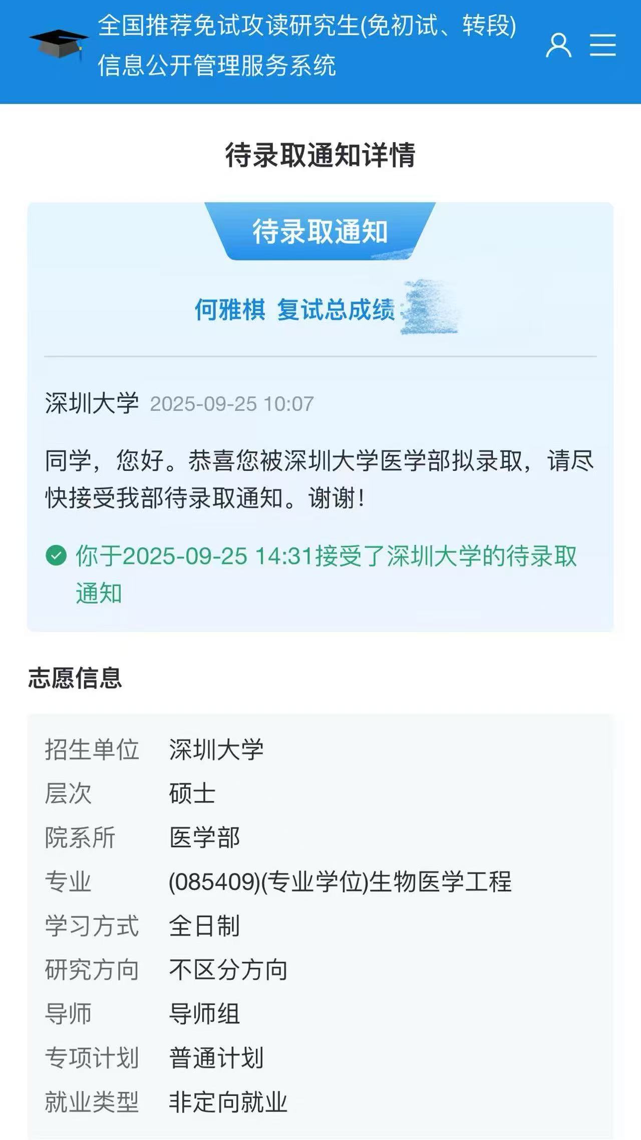 本网讯(图文/葛雪晗)近日,我院首届推荐优秀应届本科毕业生免试攻读硕士研究生工作圆满落幕。经过严格选拔与激烈竞争,我院2022级智能医学工程专业学生何雅棋凭借其优异的学业成绩和综合素质,成功获得我院首个也是本年度唯一一个推免资格,并已被深圳大学医学部生物医学工程专业拟录取,即将开启研究生阶段的学习深造。