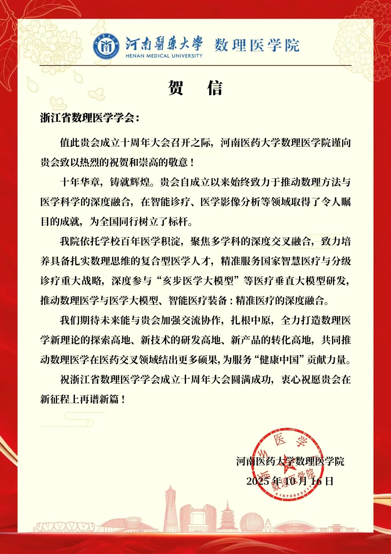 大会主席、浙江省数理医学学会理事长孔德兴教授代表大会组委会致欢迎辞。他指出,浙江省数理医学学会成立十年来,始终秉持“交叉、融合、创新、引领”的宗旨,在学科建设、科研创新与社会服务方面硕果累累。学会已发展成为拥有80多个专业委员会的庞大学术体系,并在医学人工智能等领域取得多项重大突破与创新成果。我院向浙江省数理医学学会发去贺信,向学会成立十周年表示热烈的祝贺。