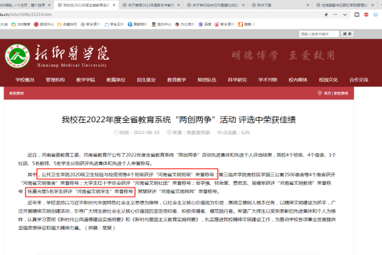 近日,河南省委教育工委、河南省教育厅公布了2022年度全省教育系统“两创两争”活动先进集体和先进个人评选结果,我校荣获佳绩。其中,我院2020级卫生检验与检疫班获评“河南省文明班级”的荣誉称号,张晨光同学获评“河南省文明学生”荣誉称号。