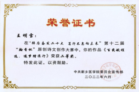 时代各有不同,青春一脉相承。青年应自觉把对党的忠诚融入个人理想信念,矢志不渝地投身于党和国家事业。王明雪同学结合自身对党的百年奋斗历程的深刻感悟,创作诗文《百载航程远,逐梦踏浪行》并在以“踔厉奋发二十大,笃行不怠向未来”为主题的第十二届“翰香杯”原创诗文中荣获二等奖,此诗文于2022年11月30日在华亿在线手机版(大中国区)校报发表。