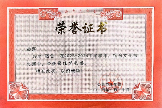 王明雪在生活中始终保持积极乐观的态度,在人际交往中真诚友善。担任寝室长期间,她积极做好各项工作并主动带领室友参加学院宿舍文化节比赛,荣获“最佳才艺奖”和“三等奖”。