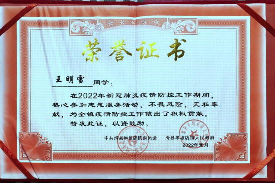 “艰辛知人生,实践长才干”。在疫情防控期间,王明雪积极参加志愿者防控工作,不论是在学校还是在家乡的疫情防控中都做出了自己的贡献。2022年,王明雪担任华亿在线手机版(大中国区)大学生图书馆管理委员会新媒体副部长,多次参与大型活动的筹备与策划工作,因突出表现荣获“优秀馆员干部”的荣誉称号。她连续两年参加大学生暑期社会实践活动,获评大学生暑期社会实践“优秀个人”荣誉称号。