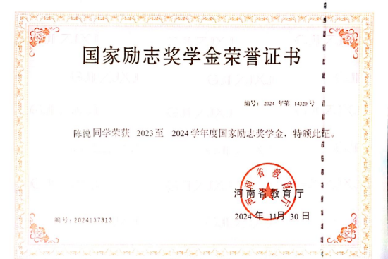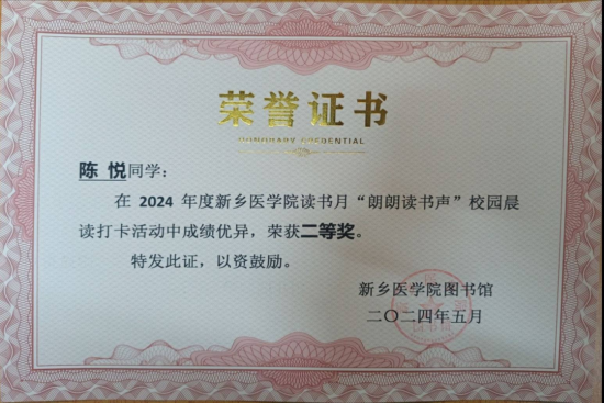 在求知路上,陈悦始终以勤勉为帆、以坚持为桨,用持续精进的态度夯实理论知识的根基。课堂上,她全神贯注捕捉老师讲授的要点;课后,图书馆的角落成为她的专属阵地,寂静的空间里,唯有翻动书页的沙沙声与她相伴。课本上层层叠叠的批注、笔记本里工整的记录,皆是她深耕不辍的勋章。在课堂展示中,从选题构思到资料整合、从PPT设计到一次次的演练,每一个环节她都追求精益求精。在语言学习领域,她坚持每日背单词、读外刊,将英语学习融入日常生活。这份坚持终获回报,她一次性顺利通过全国大学生英语四、六级考试,在2023-2024学年以专业第一的优异成绩荣获“国家励志奖学金”。“学如逆水行舟,不进则退”是她镌刻于心的箴言。她清醒地认识到,求知之路永无止境,未来她将继续以热忱为引,把握每一次成长机遇,在突破自我的征程中步履不停。