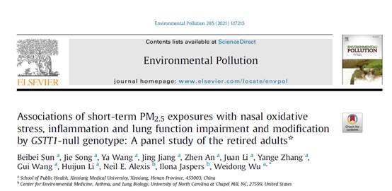 PM2.5是大气环境中空气动力学直径小于或等于2.5μm的颗粒物。现有研究表明空气污染物可能通过氧化损伤或/和炎症等机制影响心肺功能。2020年宋杰博士发现抗氧化GSTM1基因缺失可能影响臭氧诱导的在校大学生心血管效应后;本研究又发现PM2.5的暴露可导致老年人肺部氧化应激和炎症反应增强,肺功能降低,且GSTT1基因缺失可加重上述PM2.5诱导的不良呼吸系统效应。这一发现丰富了空气污染物-健康效应的流行病学研究证据,有助于识别呼吸道疾病的高危人群,提出针对性的预防措施和治疗方法。