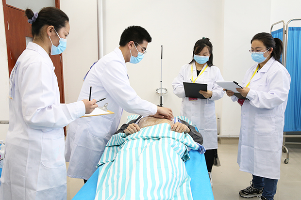 上午进行的基本操作技能竞赛设置个体防护、样本采集、现场检测、卫生处理、体格检查、现场急救、案例分析等7个站点。参赛选手分工明确,操作有条不紊,展现了扎实的临床专业技能和默契的团队协作能力。下午进行公共卫生基本理论笔试考核。