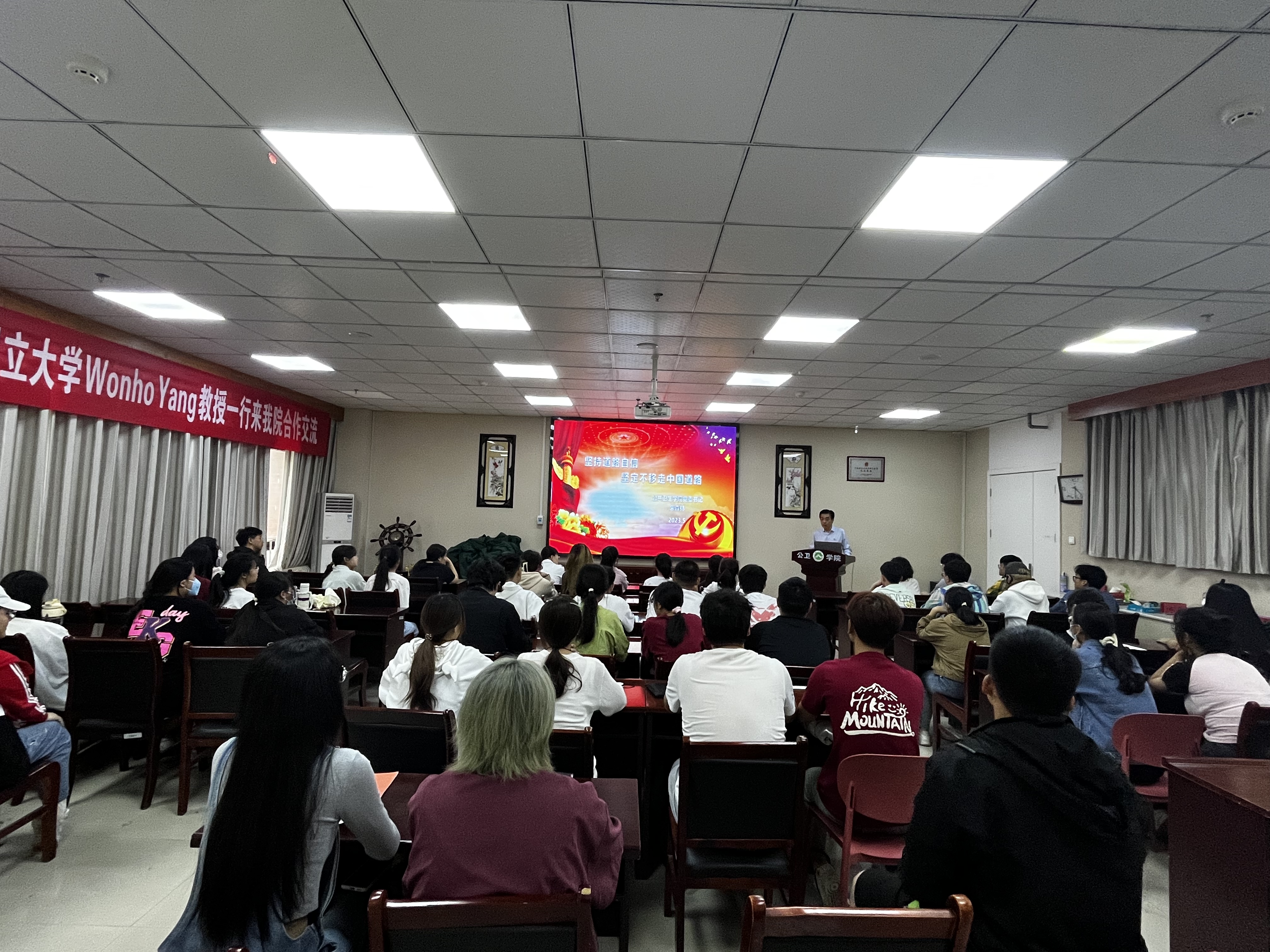 5月26日,公共卫生学院党委在学院学术报告厅开展学习贯彻习近平新时代中国特色社会主义思想主题教育“书记讲党课”学院党委书记朱森林作了坚持道路自信,坚定不移走中国道路为主题的专题党课。本科生参与党课学习。