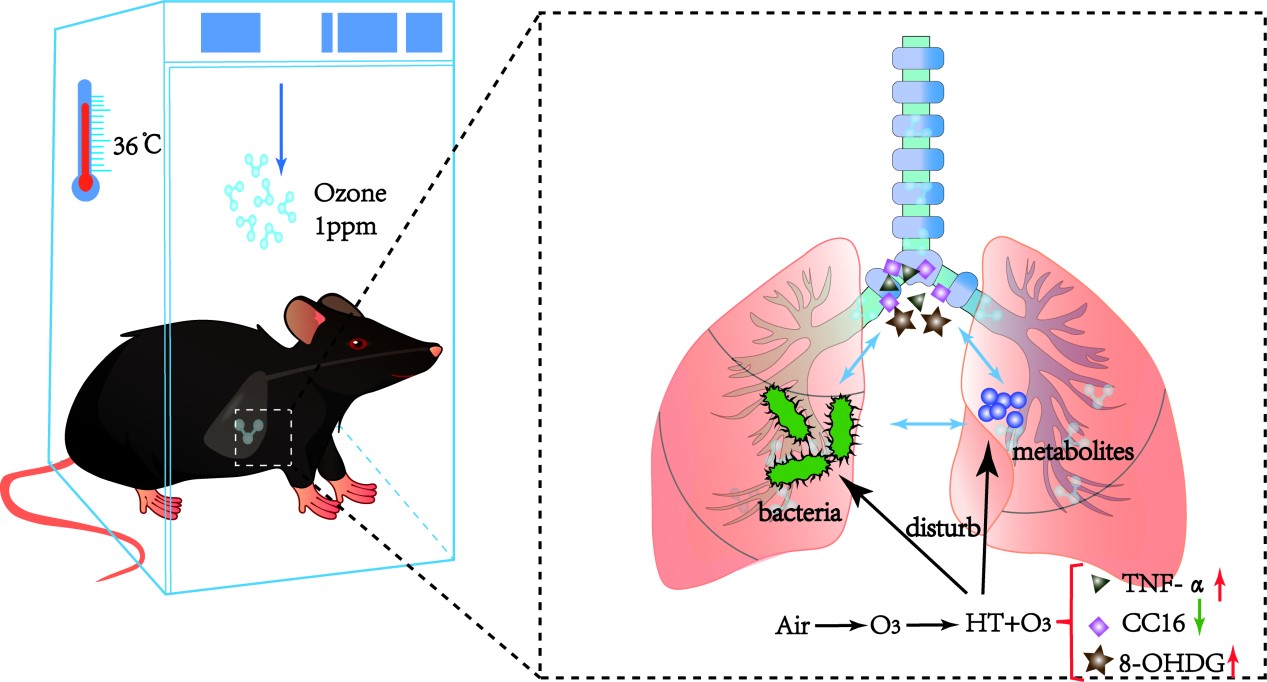 该研究基于气候因素和空气污染共存互作现状,利用动物模型和团队构建的具有自主知识产权的国内一流动物暴露装置,探讨高温对气体污染物臭氧(Ozone, O3)所致呼吸道气道炎症的影响。研究发现,吸入O3可引发C57BL/6N小鼠气道氧化应激和炎症,高温可加重该效应。联合暴露高温还可加重O3诱导呼吸道微生态和代谢组紊乱。进一步分析显示高温和O3共同暴露引起的微生物群失调、代谢紊乱、氧化应激和炎症之间具有显著相关性。项目组正在利用菌群清除和体外研究进一步验证上述发现并揭示潜在机制。