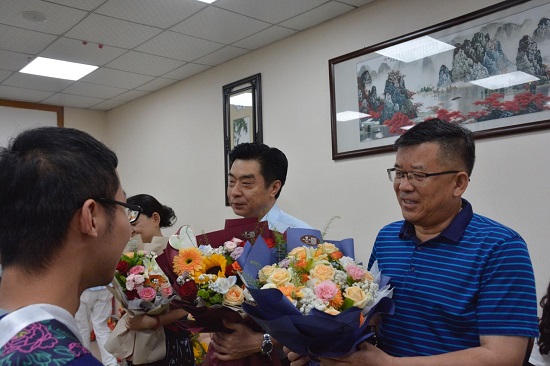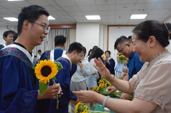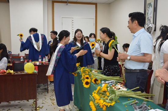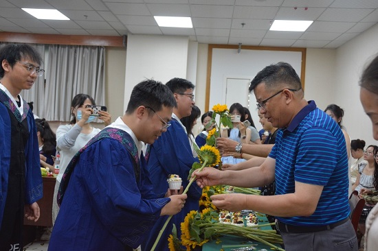 之后,在热情欢快的旋律中老师向大家分发蛋糕、向日葵庆祝毕业,毕业生代表亦向老师们赠送了精心准备的鲜花,现场气氛热烈,老师同学们热情洋溢。