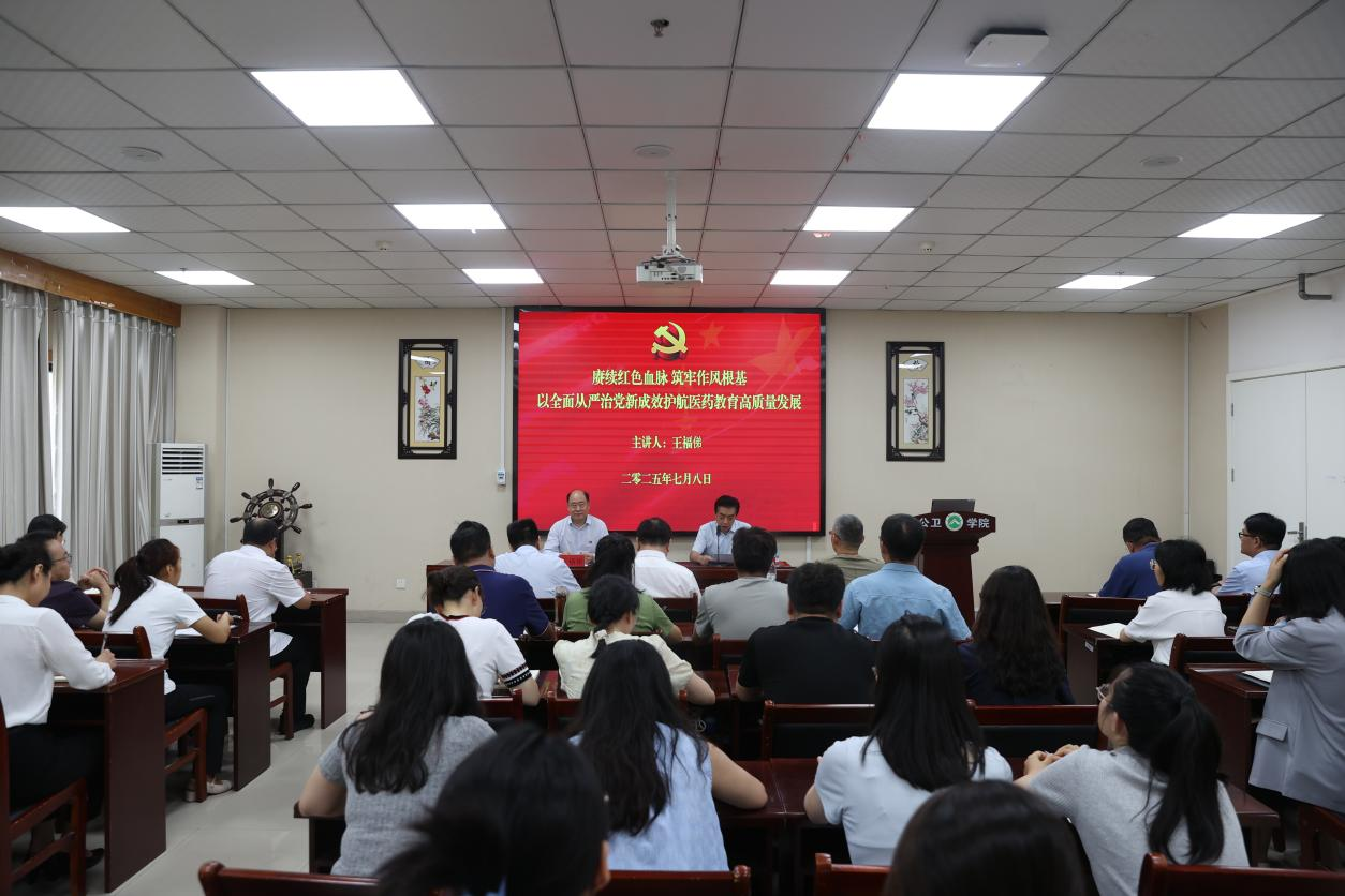 7月8日上午,校长王福俤在学院学术报告厅《赓续红色血脉 筑牢作风根基 以全面从严治党新成效护航医药教育高质量发展》为题,为全院党员干部师生讲授专题党课。深入贯彻中央八项规定精神学习教育省委第六督导组组长王付林和成员张宝元、张业勋出席,学院全体院领导、师生党员参加了本次党课学习。党课由学院党委书记朱森林主持。