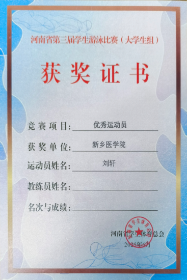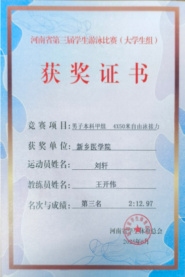 在此次比赛中,我院2022级预防专业学生刘轩与队友在4×50米自由泳接力男子大学甲组中荣获第三名。刘轩同时荣获优秀运动员称号。