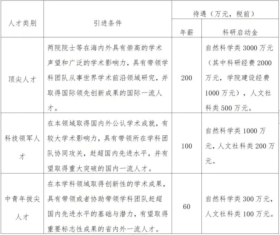 引进的高层次人才分为三个类别,分别是顶尖人才、科技领军人才和中青年拔尖人才。具体引进范围如下,待遇不低于以下标准: