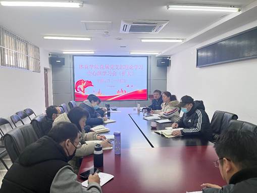 2023年2月16日上午11点,体育学院直属党支部召开专题学习会议,再次学习研讨党的二十大报告。根据工作安排,此次学习采用集体学习、观看视频、专题研讨与个人自学等相结合的方式。党员领导干部、党小组组长、各科室负责人参加会议。